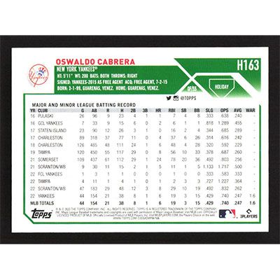 This is a 2023 Topps Holiday Oswaldo Cabrera baseball card. The card is #H163 and pictures show condition.