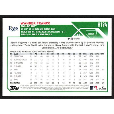 This is a 2023 Topps Holiday Wander Franco baseball card. The card is #H194 and pictures show condition.