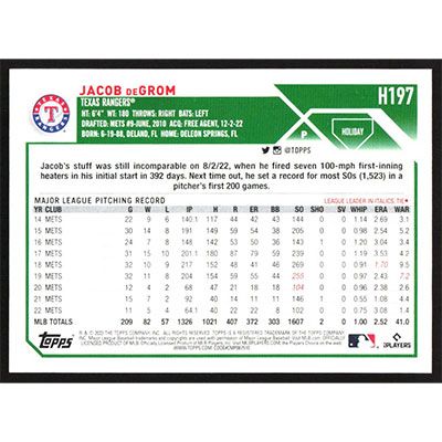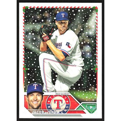 This is a 2023 Topps Holiday Jacob deGrom baseball card. The card is #H197 and pictures show condition.