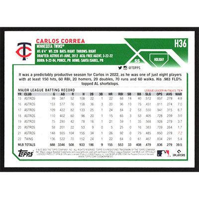 This is a 2023 Topps Holiday Carlos Correa baseball card. The card is #H36 and pictures show condition.