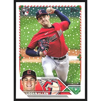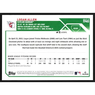 This is a 2023 Topps Holiday Logan Allen baseball card. The card is #H46 and pictures show condition.