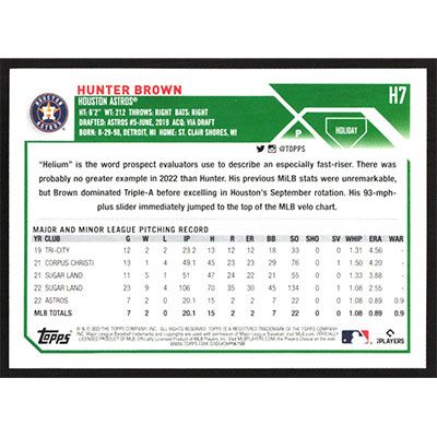 This is a 2023 Topps Holiday Hunter Brown baseball card. The card is #H7 and pictures show condition.