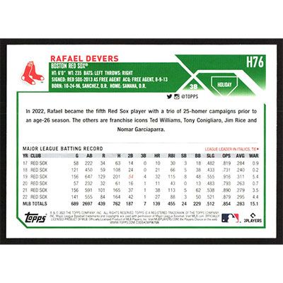 This is a 2023 Topps Holiday Rafael Devers baseball card. The card is #H76 and pictures show condition.