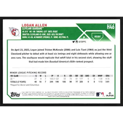 This is a 2023 Topps Holiday Metallic Logan Allen baseball card. The card is #H46 and pictures show condition. Team(s): Cleveland Guardians Rookie Card (RC)