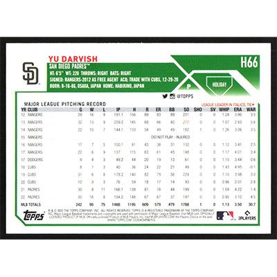 This is a 2023 Topps Holiday Metallic Yu Darvish baseball card. The card is #H66 and pictures show condition.