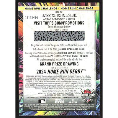 This is a 2023 Topps Home Run Challenge Code Cards Jazz Chisholm Jr. baseball card. The card is #HRC-12 and pictures show condition. Team(s): Miami Marlins