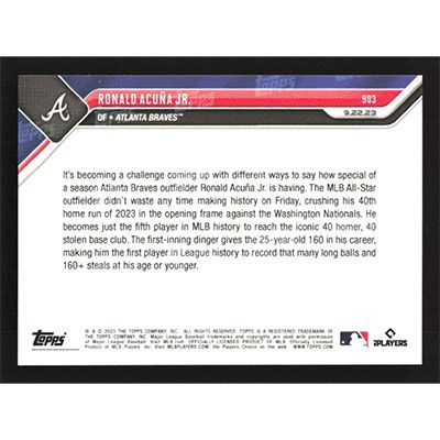 This is a 2023 Topps Now Ronald Acuña Jr. 40/40 baseball card. The card is #903 and pictures show condition.