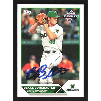 This is a 2023 Topps Pro Debut Blake Burkhalter autographed baseball card. This card has been signed, in blue, by Blake Burkhalter, and is guaranteed authentic by Ballcardz.com. The card is #PD-187 and pictures show condition.