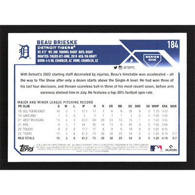 This is a 2023 Topps Rainbow Foil Beau Brieske baseball card. The card is #184 and pictures show condition.