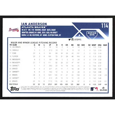 This is a 2023 Topps Royal Blue Ian Anderson baseball card. The card is #114 and pictures show condition.