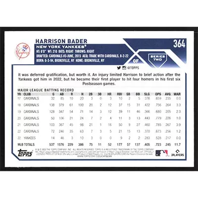 This is a 2023 Topps Royal Blue Harrison Bader baseball card. The card is #364 and pictures show condition.