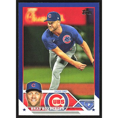This is a 2023 Topps Royal Blue Brad Boxberger baseball card. The card is #590 and pictures show condition.