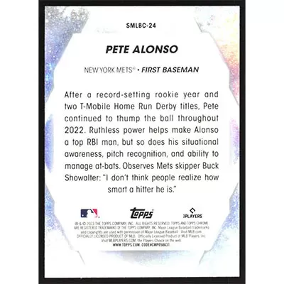 This is a 2023 Topps Stars of MLB Chrome Pete Alonso baseball card. The card is #SMLBC-24 and pictures show condition.
