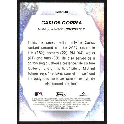 This is a 2023 Topps Stars of MLB Chrome Carlos Correa baseball card. The card is #SMLBC-48 and pictures show condition.