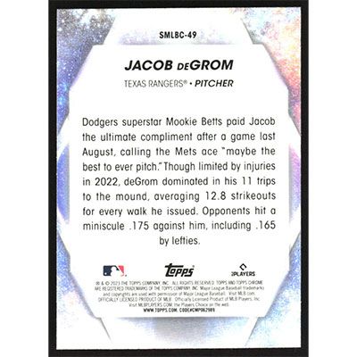 This is a 2023 Topps Stars of MLB Chrome Jacob deGrom baseball card. The card is #SMLBC-49 and pictures show condition.