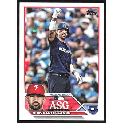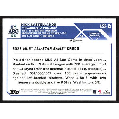 This is a 2023 Topps Update '23 All-Star Game Nick Castellanos baseball card. The card is #ASG-15 and pictures show condition. Team(s): Philadelphia Phillies