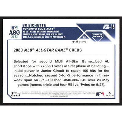 This is a 2023 Topps Update '23 All-Star Game Bo Bichette baseball card. The card is #ASG-16 and pictures show condition.
