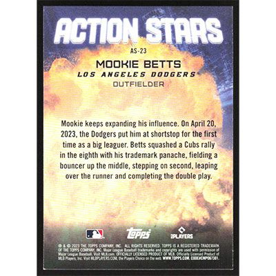 This is a 2023 Topps Update Action Stars Mookie Betts baseball card. The card is #AS-23 and pictures show condition.