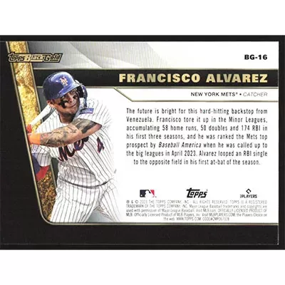 This is a 2023 Topps Update Black Gold Francisco Alvarez baseball card. The card is #BG-16 and pictures show condition. Team(s): New York Mets Rookie Card (RC)