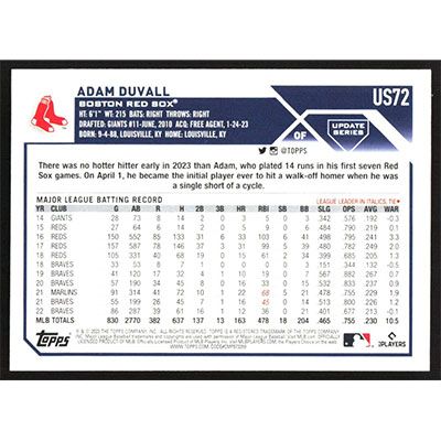 This is a 2023 Topps Update Halloween Orange and Black Foil Adam Duvall baseball card. The card is #US72 and pictures show condition. Team(s): Boston Red Sox