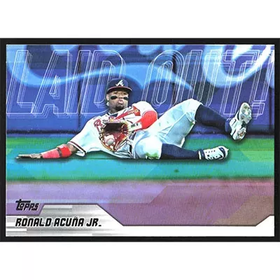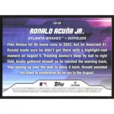 This is a 2023 Topps Update Laid Out Ronald Acuña Jr. baseball card. The card is #LO-16 and pictures show condition.