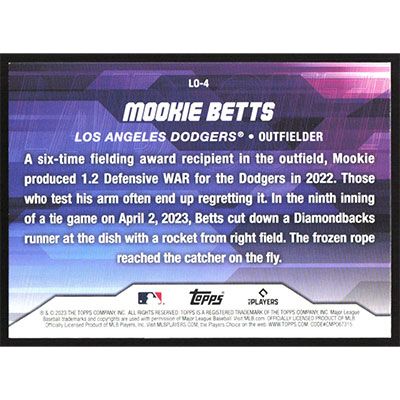 This is a 2023 Topps Update Laid Out Mookie Betts baseball card. The card is #LO-4 and pictures show condition.