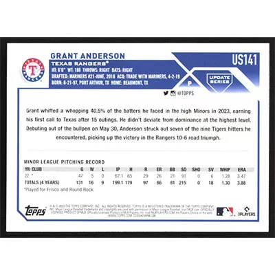 This is a 2023 Topps Update Rainbow Foil Grant Anderson baseball card. The card is #US141 and pictures show condition. Team(s): Texas Rangers Rookie Card (RC)