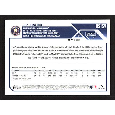 This is a 2023 Topps Update Rainbow Foil J.P. France baseball card. The card is #US159 and pictures show condition. Team(s): Houston Astros Rookie Card (RC)