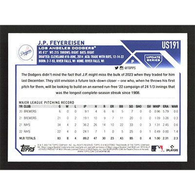 This is a 2023 Topps Update Rainbow Foil J.P. Feyereisen baseball card. The card is #US191 and pictures show condition.