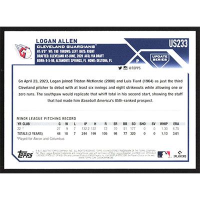 This is a 2023 Topps Update Royal Blue Logan Allen baseball card. The card is #US233 and pictures show condition. Team(s): Cleveland Guardians Rookie Card (RC)