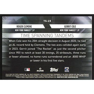 This is a 2023 Topps Update Time Spanning Tandems Roger Clemens and Gerrit Cole baseball card. The card is #TS-23 and pictures show condition. Team(s): New York Yankees