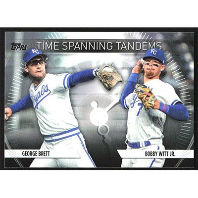 This is a 2023 Topps Update Time Spanning Tandems George Brett and Bobby Witt Jr. baseball card. The card is #TS-30 and pictures show condition. Team(s): Kansas City Royals