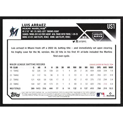 This is a 2023 Topps Update Luis Arraez baseball card. The card is #US1 and pictures show condition.