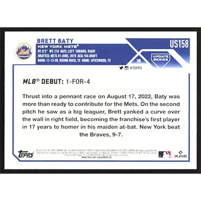 This is a 2023 Topps Update Brett Baty Rookie Debut baseball card. The card is #US158 and pictures show condition. Team(s): New York Mets Rookie Card (RC)