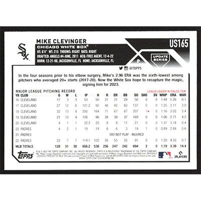 This is a 2023 Topps Update Mike Clevinger baseball card. The card is #US165 and pictures show condition.