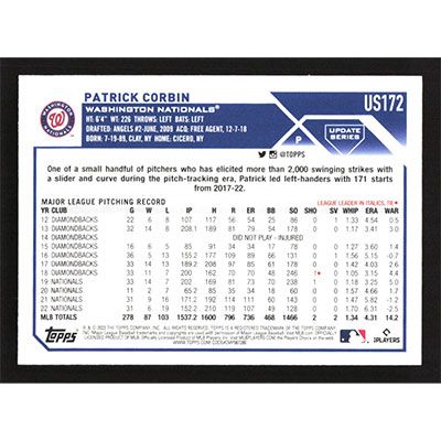 This is a 2023 Topps Update Patrick Corbin baseball card. The card is #US172 and pictures show condition.