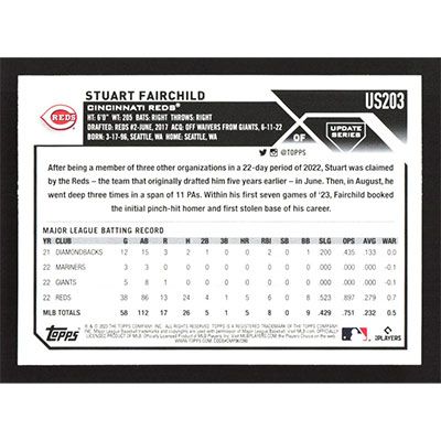This is a 2023 Topps Update Stuart Fairchild baseball card. The card is #US203 and pictures show condition.