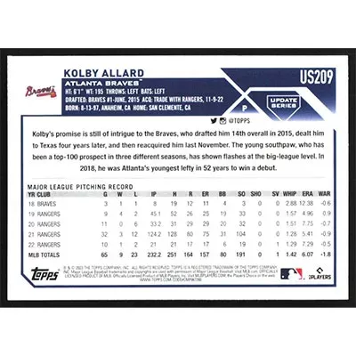 This is a 2023 Topps Update Kolby Allard baseball card. The card is #US209 and pictures show condition.