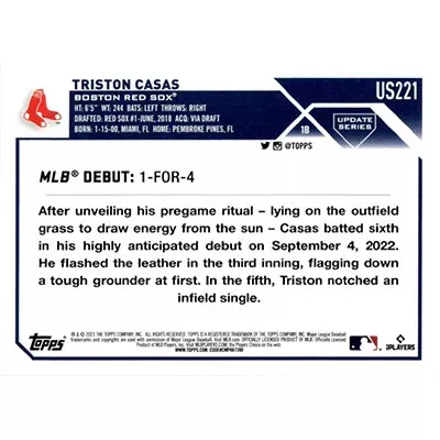This is a 2023 Topps Update Triston Casas Rookie Debut baseball card. The card is #US221 and is in NM-MT condition.