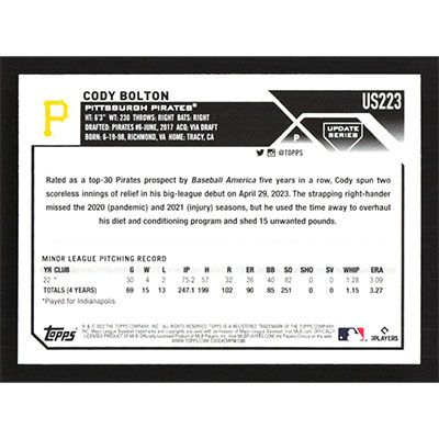 This is a 2023 Topps Update Cody Bolton baseball card. The card is #US223 and pictures show condition.