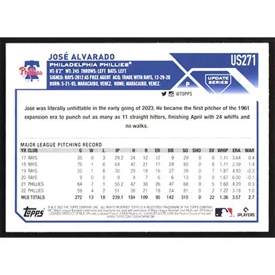 This is a 2023 Topps Update Jose Alvarado baseball card. The card is #US271 and pictures show condition.