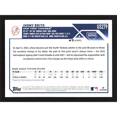 This is a 2023 Topps Update Jhony Brito baseball card. The card is #US279 and pictures show condition.