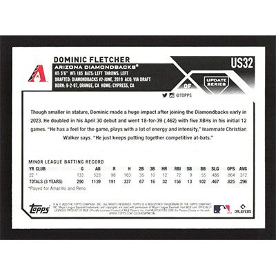 This is a 2023 Topps Update Dominic Fletcher baseball card. The card is #US32 and pictures show condition. Team(s): Arizona Diamondbacks Rookie Card (RC)