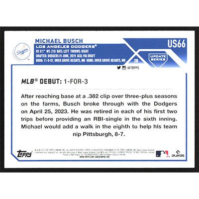 This is a 2023 Topps Update Michael Busch Rookie Debut baseball card. The card is #US66 and pictures show condition. Team(s): Los Angeles Dodgers Rookie Card (RC)