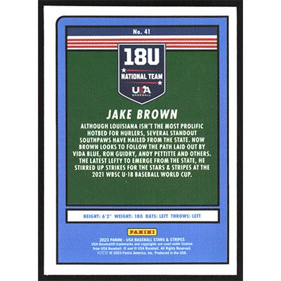This is a 2023 USA Baseball Stars & Stripes Jake Brown baseball card. The card is #41 and pictures show condition.