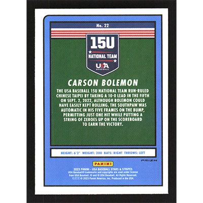This is a 2023 USA Baseball Stars & Stripes Red White and Blue Carson Bolemon baseball card. The card is #22 and pictures show condition.