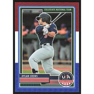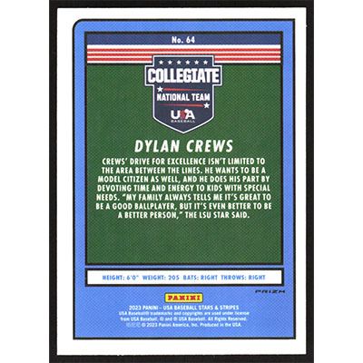 This is a 2023 USA Baseball Stars & Stripes Red White and Blue Dylan Crews baseball card. The card is #64 and pictures show condition.