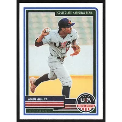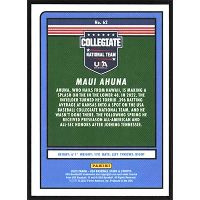 This is a 2023 USA Stars & Stripes Maui Ahuna baseball card. The card is #62 and pictures show condition.