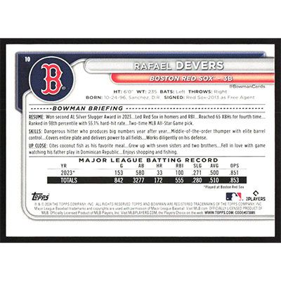 This is a 2024 Bowman Rafael Devers baseball card. The card is #10 and pictures show condition.