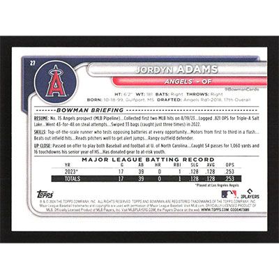 This is a 2024 Bowman Jordyn Adams baseball card. The card is #27 and pictures show condition.